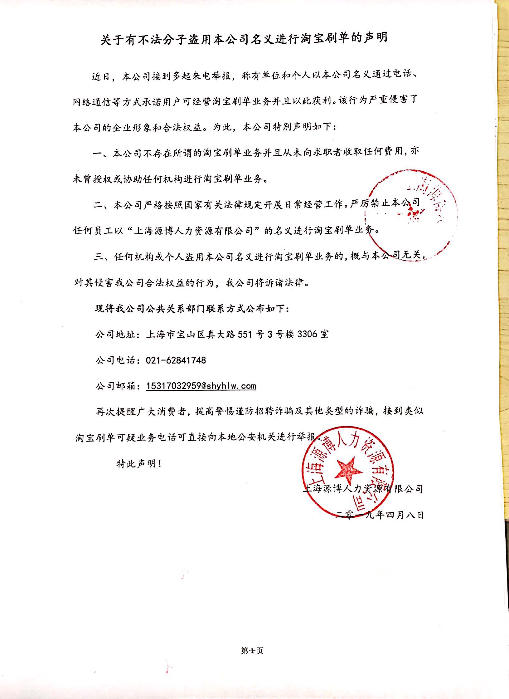 关于有不法分子盗用本公司名义进行淘宝刷单